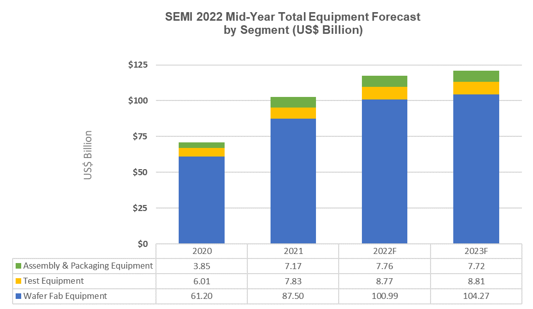 SEMI said in line with the semiconductor industry’s push from huge investments in digital facilities to increase and upgrade capacity, the wafer fab equipment segment could reach the $100 billion milestones for the first time in 2022.