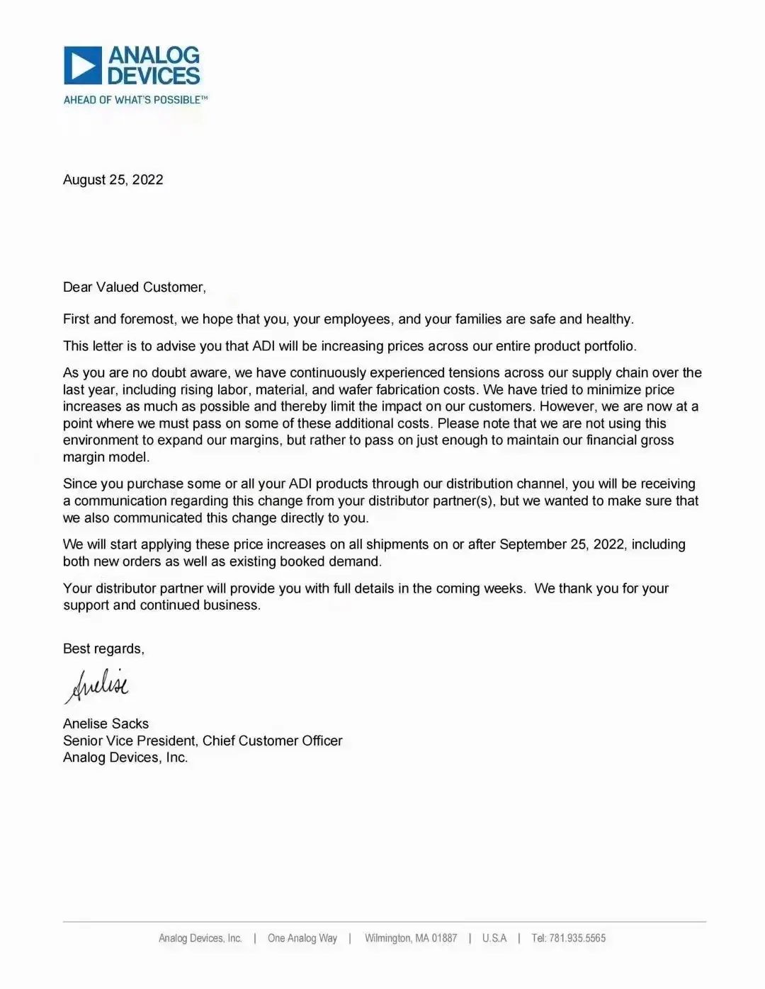 According to the price increase letter circulated in the industry, ADI will increase the price of the entire product line, including new orders and existing booking requirements, but did not disclose the specific rate of increase, the price increase will be implemented from September 25, 2022 onwards.