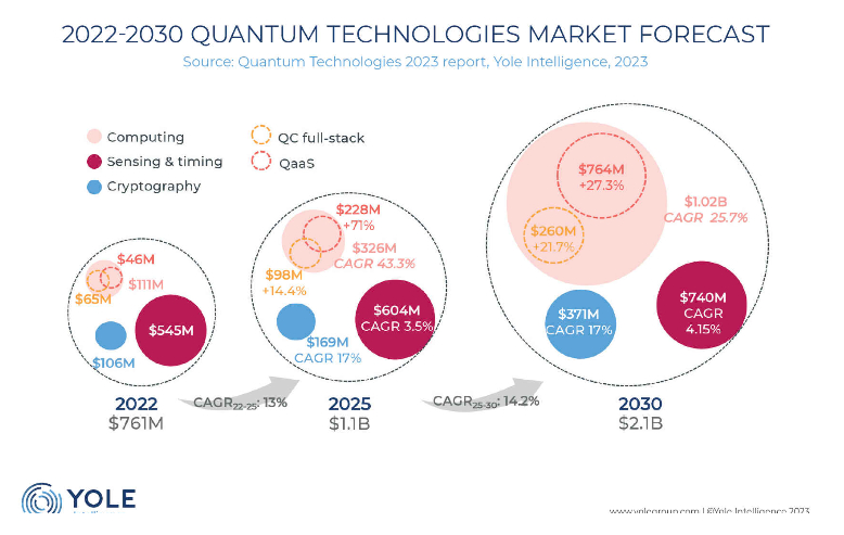 Breaking this down to sub-markets: quantum computing was worth $65 million in 2022, which Yole differentiates from Quantum computing as a service (QaaS), which it reckons was worth $46 million.